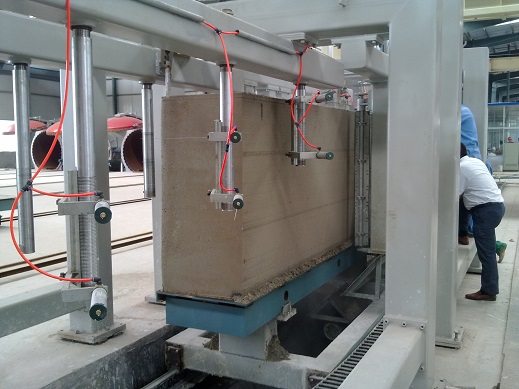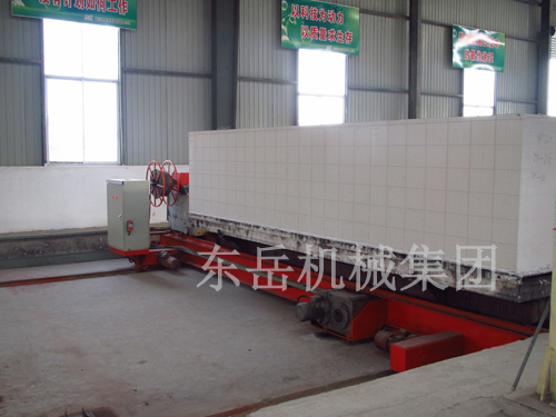 澆注后模具用輸送鏈推入初養(yǎng)室進(jìn)行發(fā)氣初凝,室溫為50~70℃,初養(yǎng)時(shí)間為1.5-2小時(shí)(根據(jù)地理有利條件,可免去此工藝),初養(yǎng)后用負(fù)壓吊具將??蚣芭黧w一同吊到預(yù)先放好釜底板的切割臺(tái)上.脫去??颍懈顧C(jī)即對坯體進(jìn)行橫切、縱切、銑面包頭,??虻趸氐竭\(yùn)模車上人工清理和除油,然后吊到模車上組模進(jìn)行下一次澆注,切好后的坯體連同釜底板用天車吊到釜車上碼放兩層,層間有四個(gè)支撐,若干個(gè)釜車編為一組。 加氣塊切割機(jī)