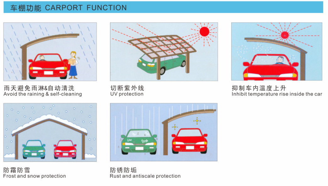聚碳酸酯板可以有效隔斷炎炎夏日里陽光中的紫外線,保護(hù)愛車肌膚永遠(yuǎn)光亮如初。同時(shí)保護(hù)愛車的輪胎免受雨水侵蝕風(fēng)吹日曬而過旱老化,從而確保行車安全。